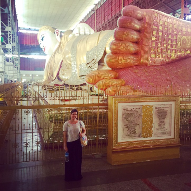 We started this mega adventure flying with Air Asia (cheap flights) from KL to Yangon. Yangon’s airport is really nice, brand new (to be honest didn’t expect that!). We went directly to the hotel, which was in downtown, really easy access and close to many attractions. However, the hotel is located in a very narrow street and was suuper dark!—At that moment Naty and I got a little worry about choosing that hotel, even thought “oh my, this might not be a good neighborhood!” :O … It was our perception, and mostly our “Latin Perception”, because next morning when we were going out, it looked all good around.