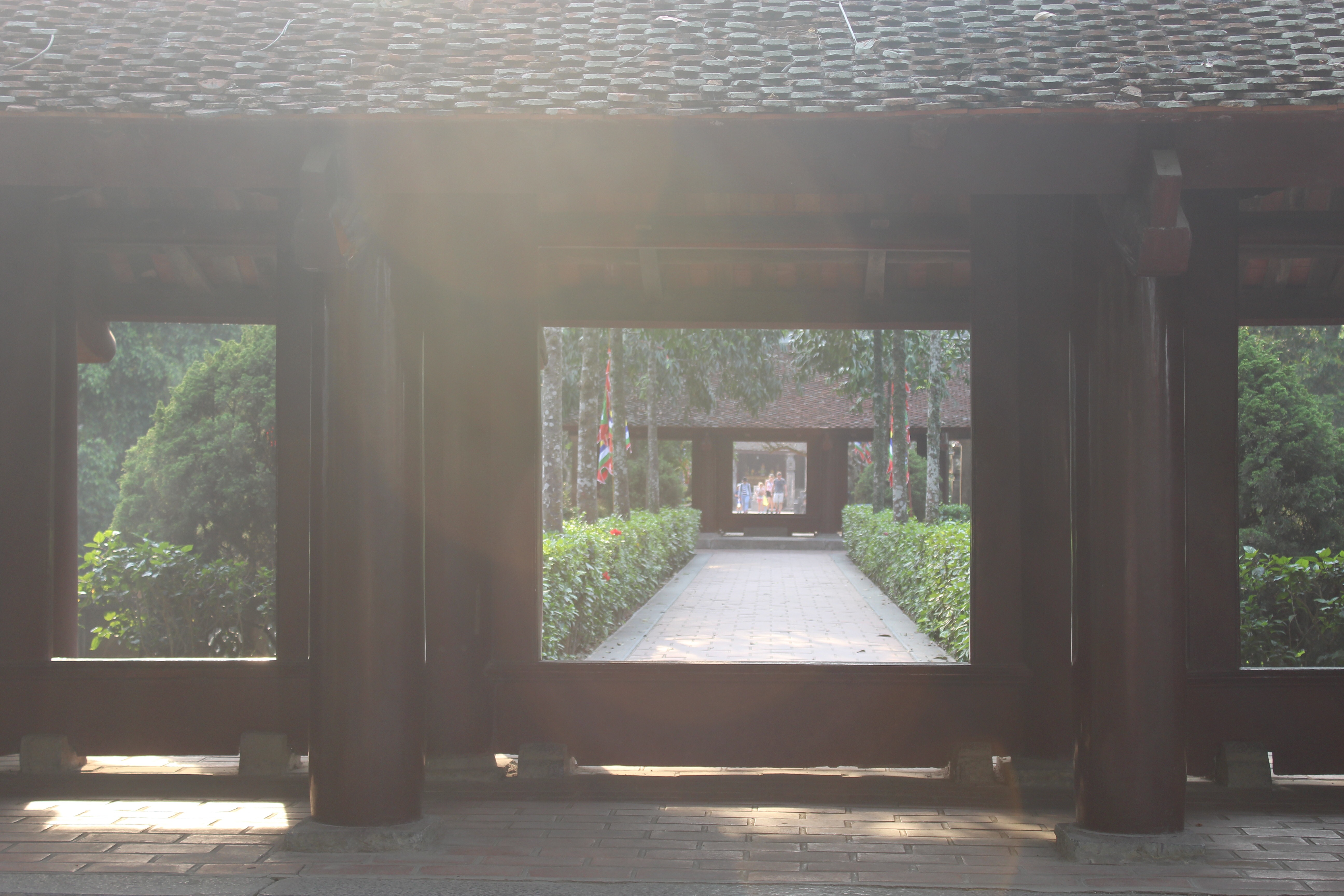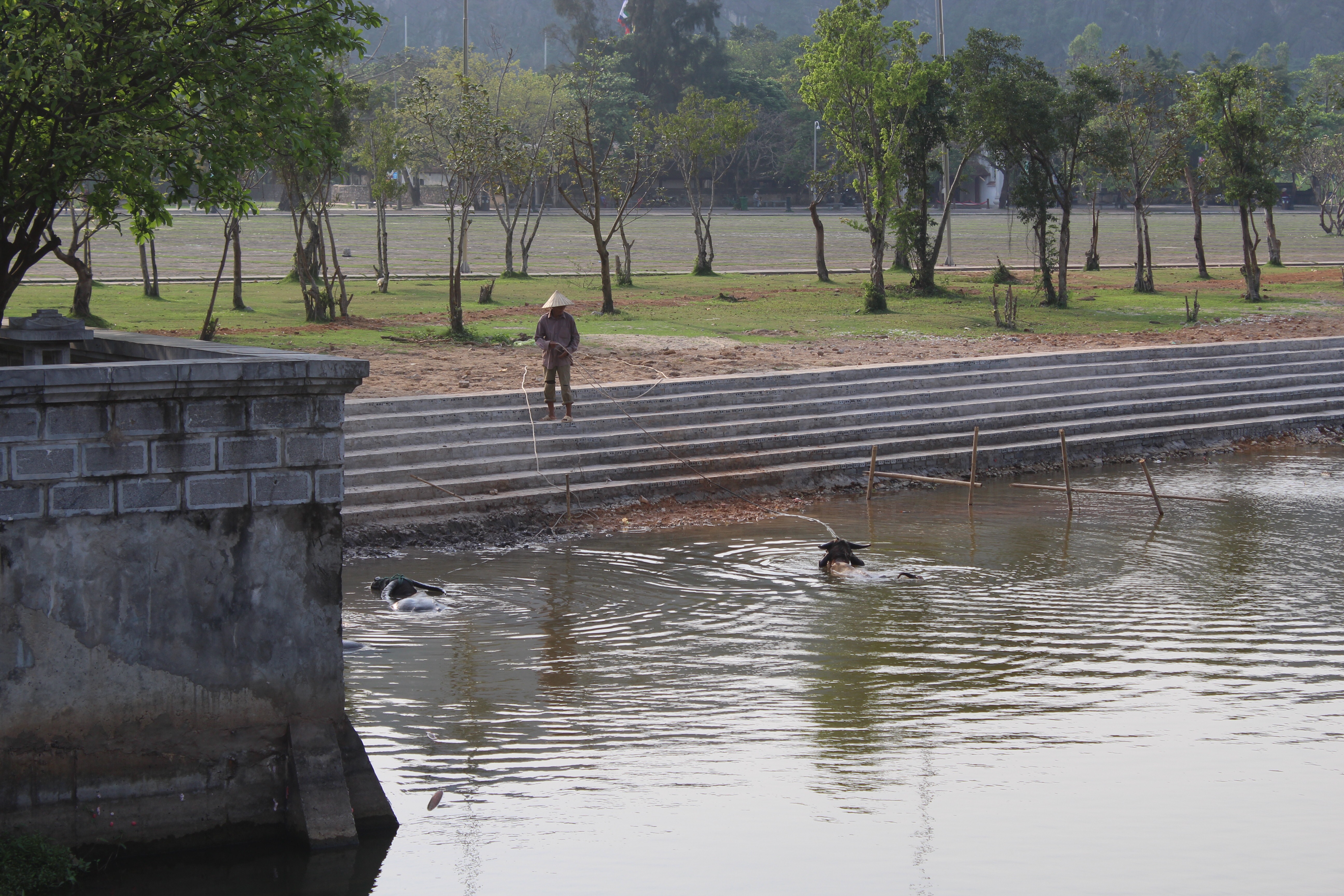 We went back to the van, and we border the river in order to make it to the Hoa Lu Ancient Capital where you can find the Dinh Dynasty temple. When you get there, there is an enormous bridge separating the little island where the temples of Kings Dinh and Le are, from the land. Walking through the bridge, buffalos taking a shower, people on their motorcycles, in their bicycles, taking pictures, walking around—everything looked like a movie set. How much perfection and synchronization can you see in such place?